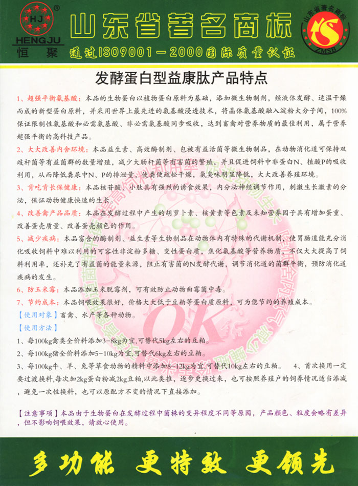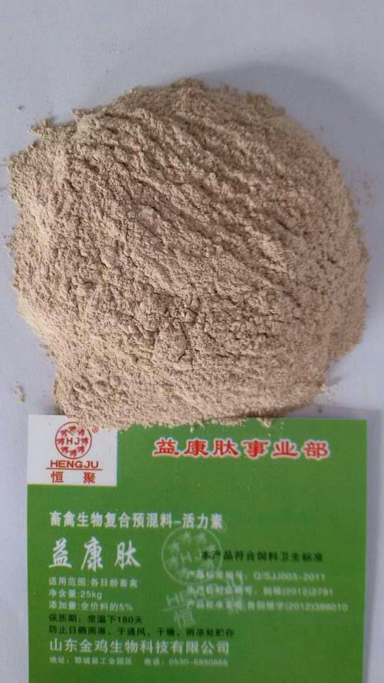 山东金鸡生物科技有限公司与国内外大型生物饲料研究机构进行了广泛的技术交流。取得了自主研发的新成果——新一代发酵蛋白型益康肽,不仅具有除臭、除蝇蛆,防水便、防饲料便,提高饲料利用率,维护肠道和呼吸道健康、促生长、脱玉米霉,还具有替代部分蛋白原料,节约成本等功能。