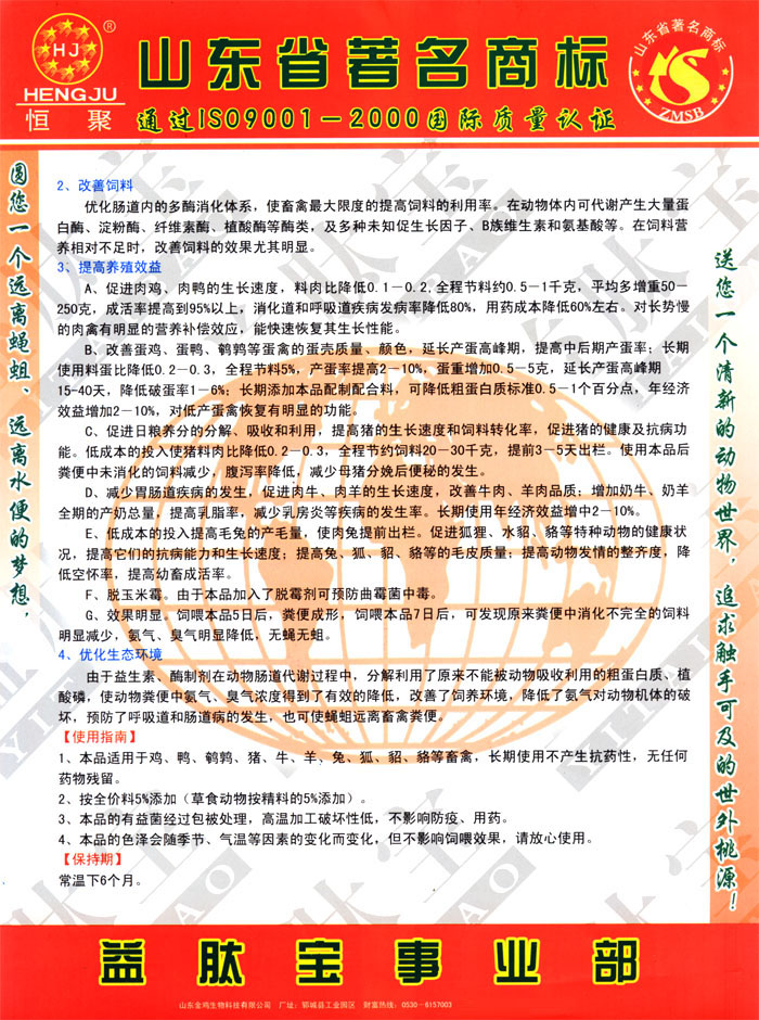 山东金鸡生物科技有限公司与国内外大型生物饲料研究机构进行了广泛的技术交流,并积极吸收其研究成果的基础上自主研发出新一代生物饲料产品——益肽宝,不仅具有除臭、除蝇蛆,防水便、防饲料便,提高饲料利用率,维护肠道和呼吸道健康、促生长、脱玉米霉等功能。