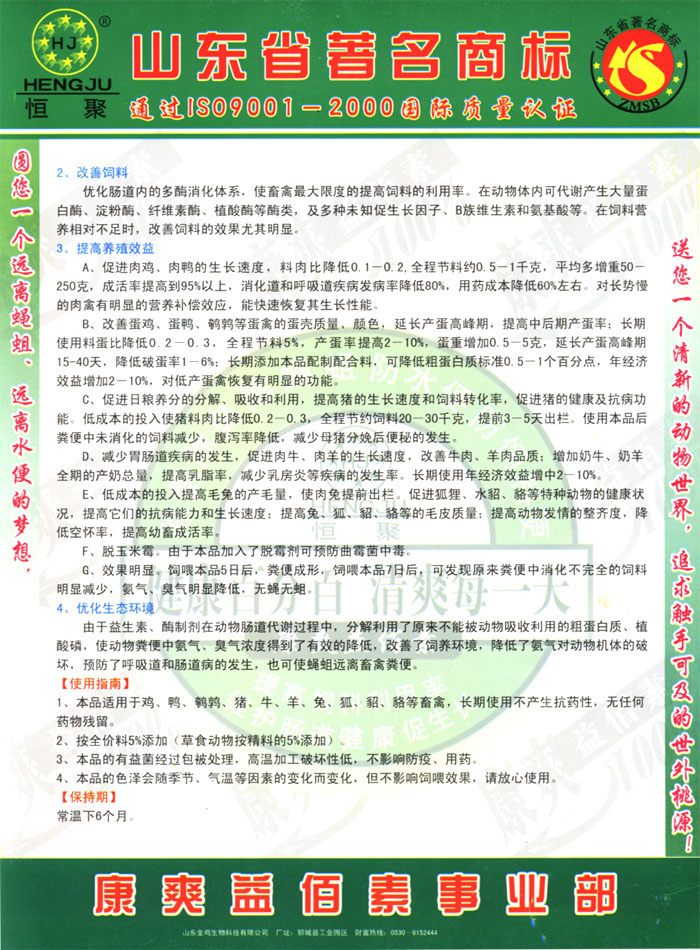 山东金鸡生物科技有限公司与国内外大型生物饲料研究机构进行了广泛的技术交流,并积极吸收其研究成果的基础上自主研发出新一代生物饲料产品——康爽益佰素,不仅具有除氨、除臭、除蝇蛆,防水便、防饲料便,提高饲料利用率,维护肠道和呼吸道健康、促生长、脱玉米霉等功能。