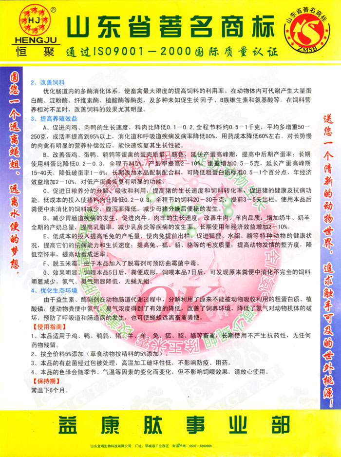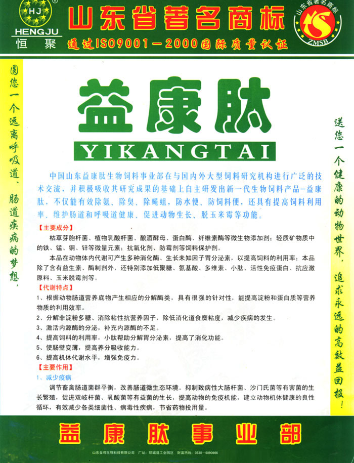 山东金鸡生物科技有限公司与国内外大型生物饲料研究机构进行了广泛的技术交流。取得了自主研发的新成果——新一代发酵蛋白型益康肽,不仅具有除臭、除蝇蛆,防水便、防饲料便,提高饲料利用率,维护肠道和呼吸道健康、促生长、脱玉米霉,还具有替代部分蛋白原料,节约成本等功能。