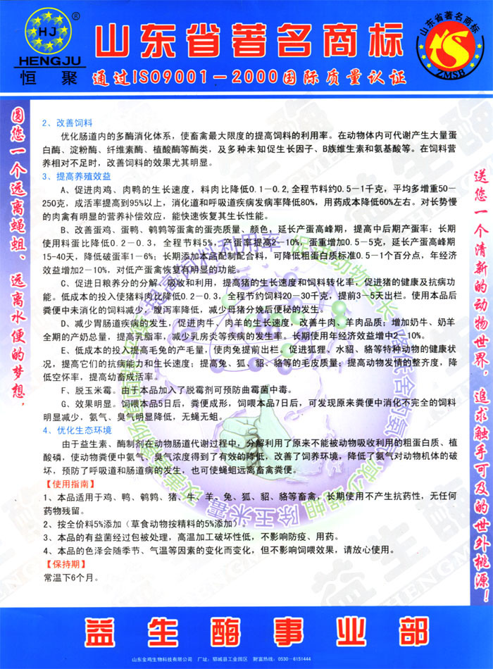山东金鸡生物科技有限公司与国内外大型生物饲料研究机构进行了广泛的技术交流,并积极吸收其研究成果的基础上自主研发出新一代生物饲料产品——益生霉,不仅具有除臭、除蝇蛆,防水便、防饲料便,提高饲料利用率,维护肠道和呼吸道健康、促生长、脱玉米霉等功能。