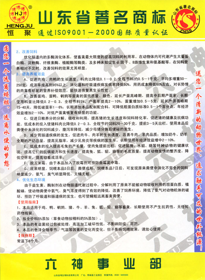 山东金鸡生物科技有限公司与国内外大型生物饲料研究机构进行了广泛的技术交流,并积极吸收其研究成果的基础上自主研发出新一代生物饲料产品——六神,不仅具有除氨、除臭、除蝇蛆,防水便、防饲料便,提高饲料利用率,维护肠道和呼吸道健康、促生长、脱玉米霉等功能。